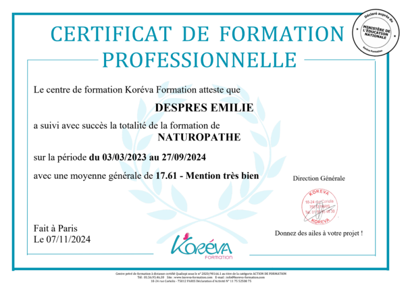 2023 - 2024 Naturopathe certifiée, Koréva, Paris.